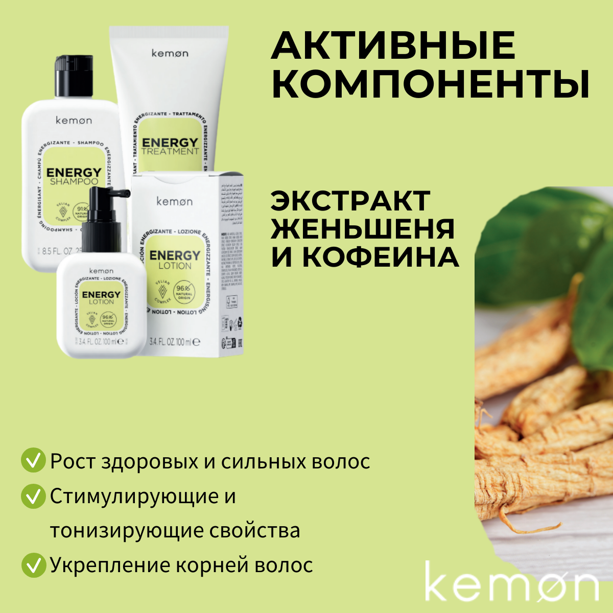 Экстракт женьшеня обладает стимулирующими и тонизирующими свойствами, а кофеин восстанавливает микроциркуляцию и укрепляет корни волос, способствуя росту здоровых и сильных волос